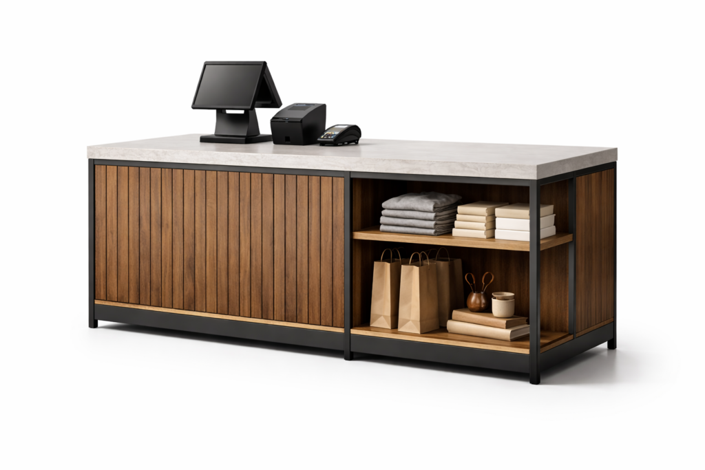 Die Theke wird individuell nach Maß gefertigt und eignet sich ideal für Einzelhandel, Büros, Praxen, Studios und Showrooms.