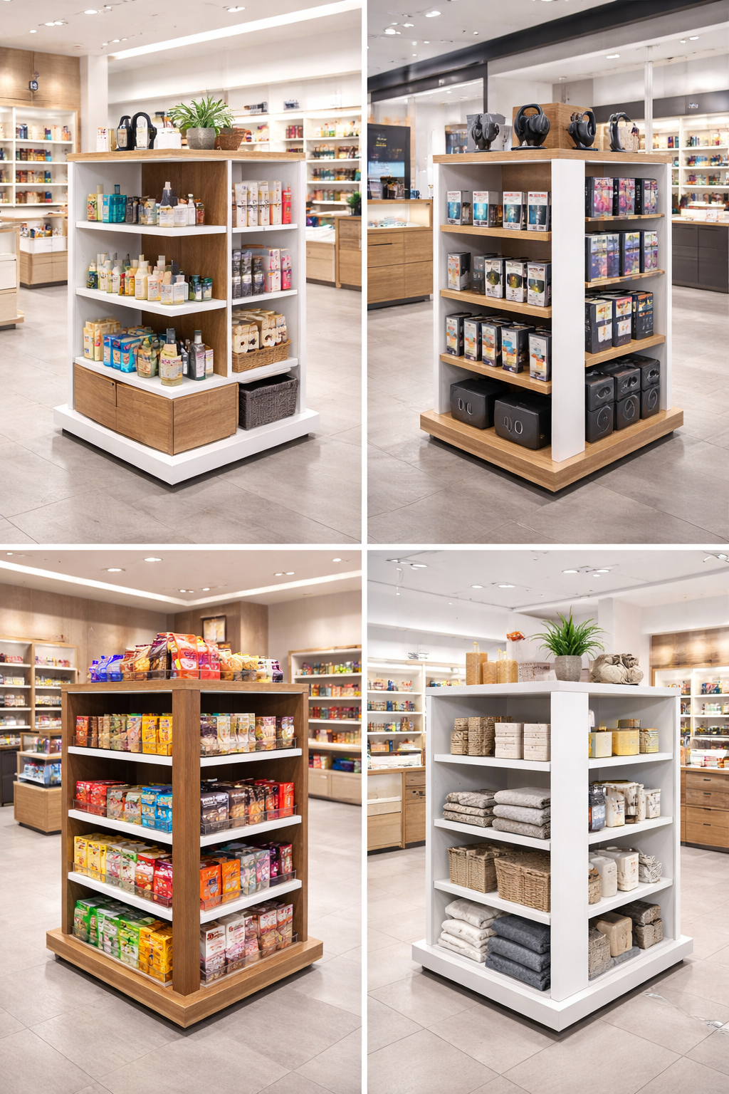 Mittelraum Verkaufsständer nach Maß – CENTER FLOW 360° Präsentationsständer