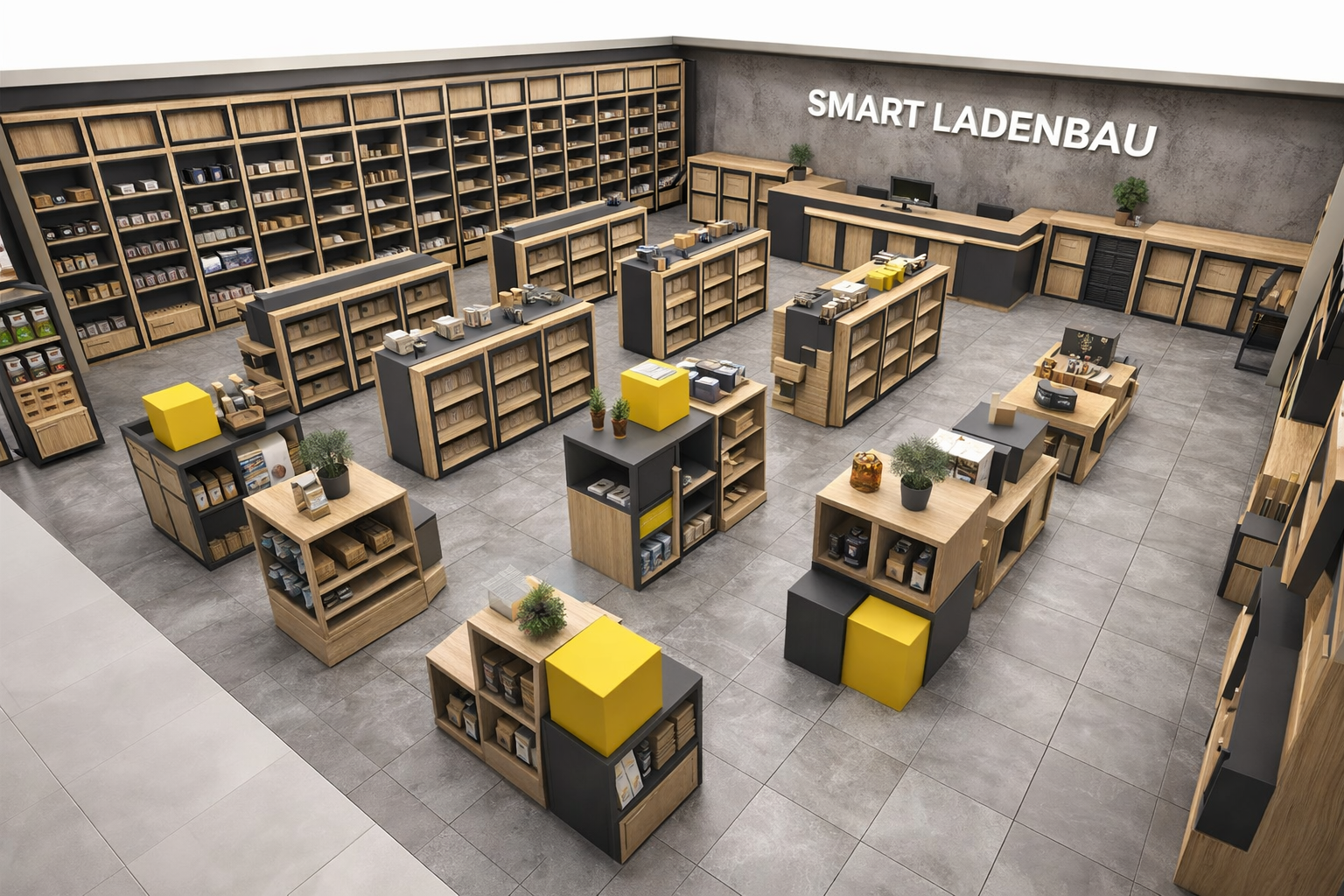 Modernes Ladenbau-Konzept für professionelle Verkaufsräume. Die Kombination aus hochwertigen Holzoberflächen und stabilen Metallkonstruktionen sorgt für eine moderne, langlebige und funktionale Ladeneinrichtung. Das Konzept umfasst Wandregale, Mittelraumregale sowie eine Kassentheke und kann individuell an Ihre Verkaufsfläche angepasst werden.